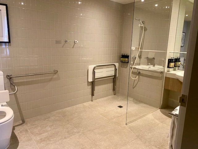 The 25 sqm en-suite bathroom is designed for ease of use, with a roll-in shower and accessibility-focused fixtures. Thoughtful in-room amenities provide convenience and comfort for all guests.